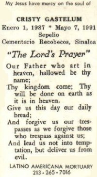 Sometimes things happen in this world that we will never understand. And we are left to wonder why about many things. I wonder why such little angels, such as Cristy Gastelum, born January 1, 1987 and litterally snatched by death, from her mother's own hands on May 7, 1991, are given to us for such a short time on this earth? But there are no earthly answers that could ever explain it well enough for us. We are certainly better for having known the smart, bright, small angel God gave us for for such a short while. And we hope that as she looks down on us from heaven as she tells her Heavenly Father kind memories of us. We also hope that you found comfort in being buried in Recobeco, Sinaloa, with generations of your very own beloved family mija. We will see you again, our little angel, when we stand in the heavens above with you. You are always in the hearts and of the large family you left behind. We know that you will keep us safely in yours. Until we meet again sweet angel... Dios la bendiga little one!